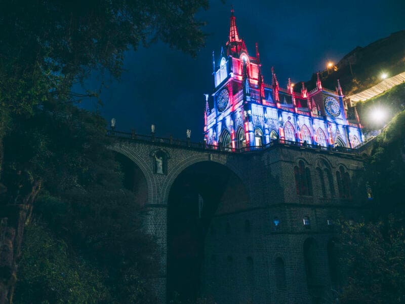 Por la noche, las iluminaciones dan al Santuario de Las Lajas un ambiente diferente, por lo que te recomendamos llegar hacia las 4:00 p.m para disfrutar del templo a la luz del día y luego de las luces por la noche.